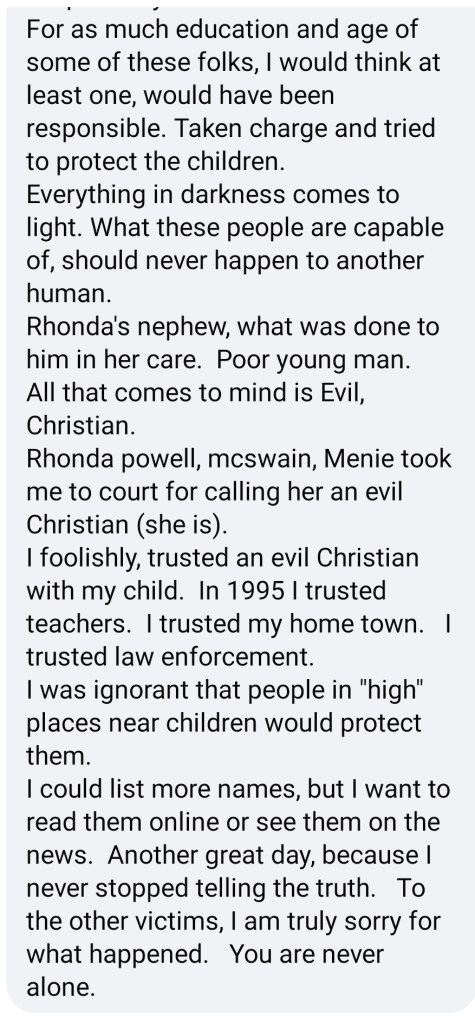 Rhonda powell, mcswain, Menie took me to court for calling her an evil Christian (she is).
